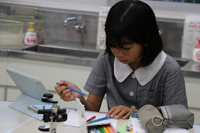 この日の授業は、解剖顕微鏡をつかって、ほうせんかの茎の水の通り道を調べました。
