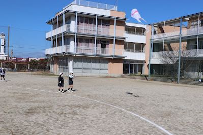 1年生が図工科で作成した凧をグラウンドで飛ばしていました。